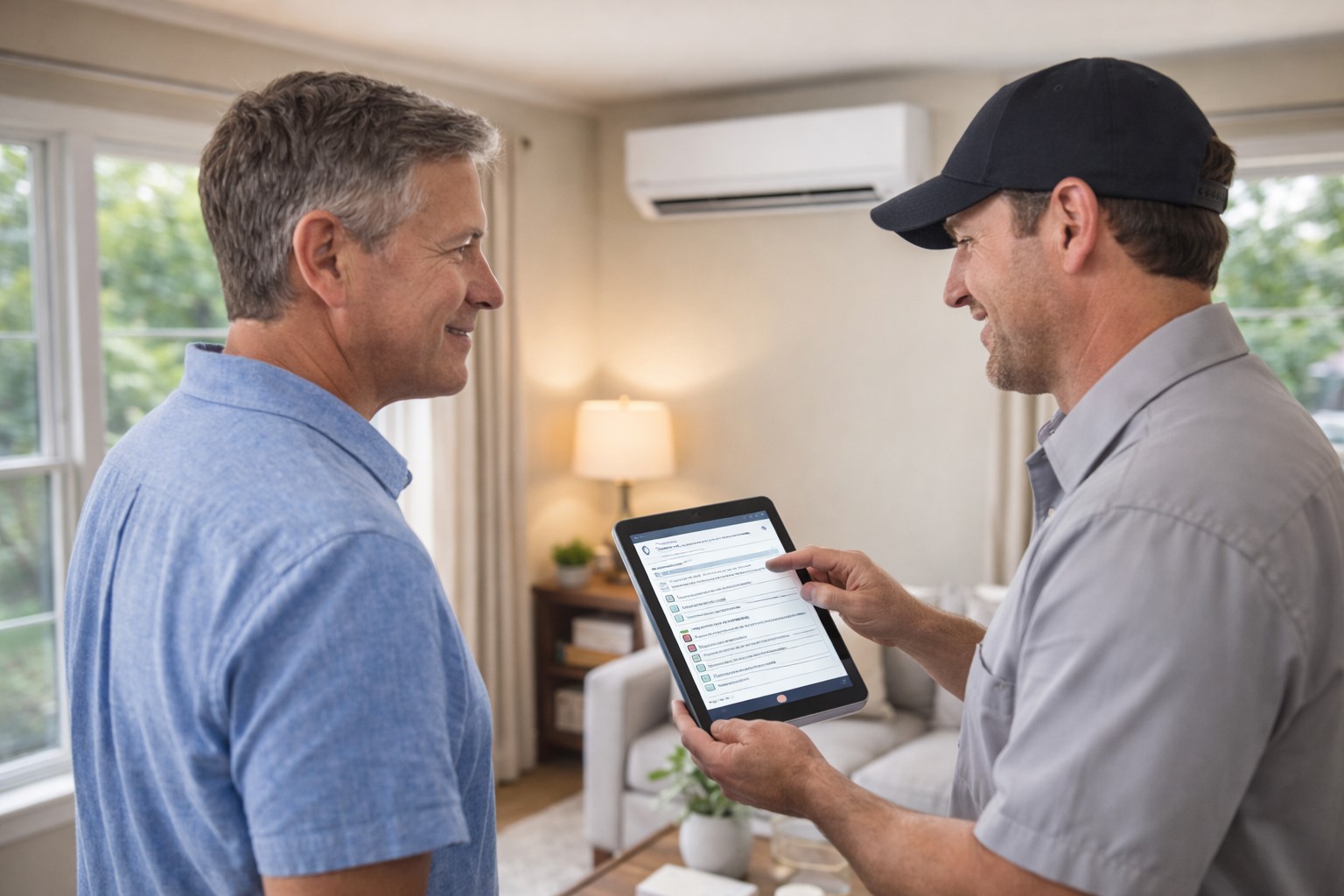Homeowner reviews heat pump maintenance checklist with HVAC technician in Beaumont home.